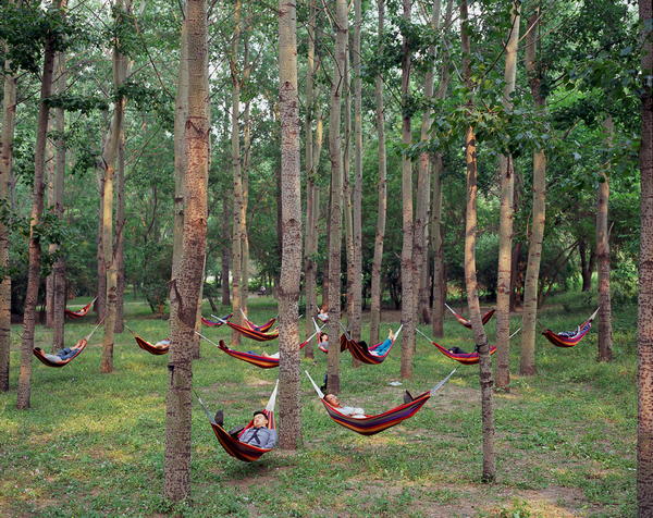 The Artist placed a lot of hammocks in a park, he invited people personally to dream together . / 艺术家在公园树林里安置了很多吊床,邀请他所认识的人们一起来做梦。 |