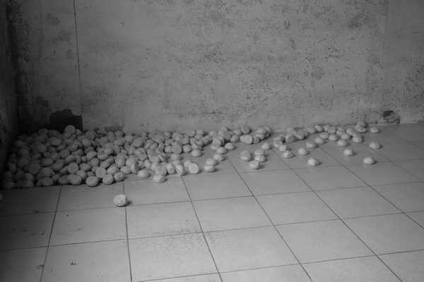 Fell a lot of steamed buns to the ground. / 很多馒头倒在地上。